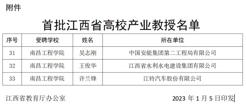 近日,首批江西省高校产业教授名单发布,我校推荐的吴志刚、王俊华、许兰锋等3名省级现代产业学院导师成功入选,体现了我校加强产教融合、校企合作,实施人才汇聚工程的工作成效。