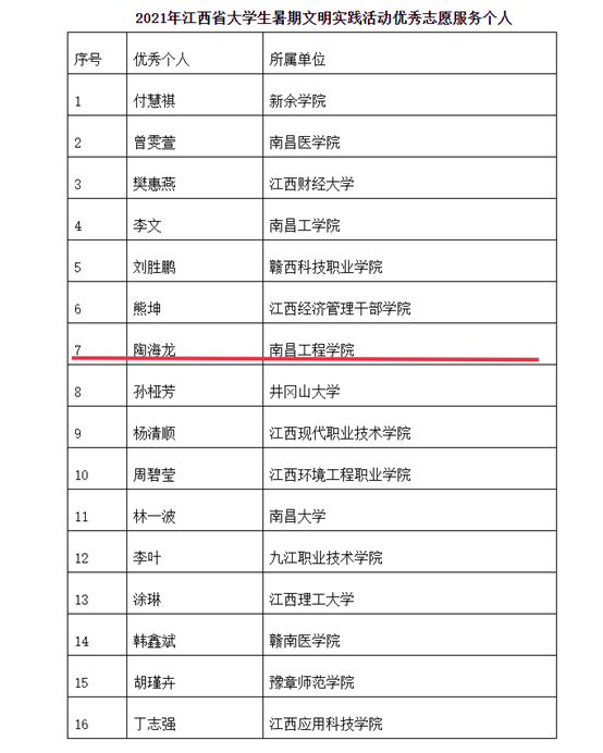 近日,省教育厅、省文明办公布了《关于2021年全省高校大学生暑期文明实践志愿行动评选结果》,我校大学生“勇担青春使命,播种科技梦想”文明实践团、赴宜春开展节水灌溉调研实践团、党史学习教育青年宣讲队三支队伍获评“优秀志愿服务团队”荣誉称号,校团委莫吉炜、水利与生态工程学院黄丹、信息工程学院阮晶晶三位教师获评“优秀指导教师”荣誉称号,人文与艺术学院2019级视觉传达设计专业学生陶海龙获评“优秀志愿服务个人”荣誉称号。