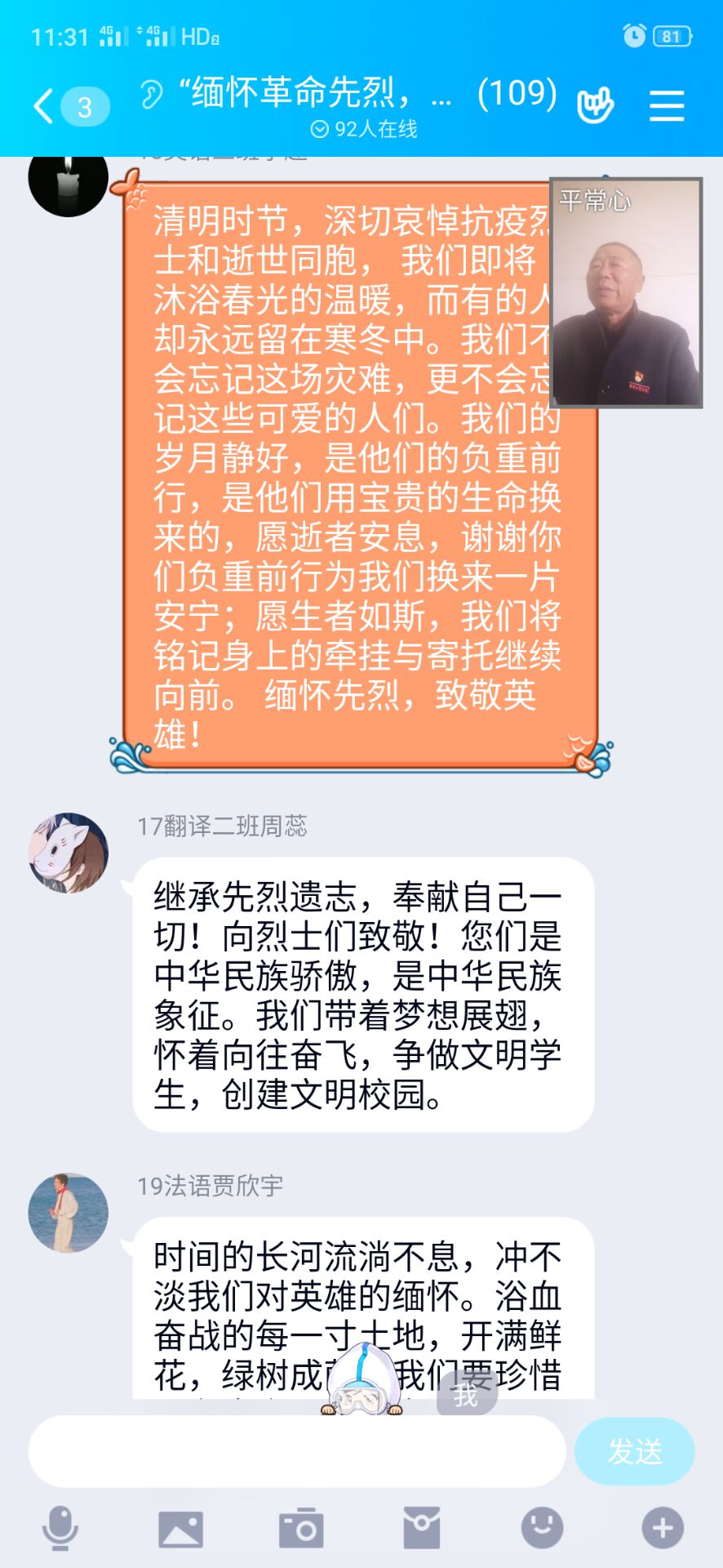“缅怀”革命先烈,弘扬民族精神。4月4日,学院党总支书记朱代洪为全体学生党员和入党积极分子代表上了一堂以“缅怀革命先烈,坚定理想信念”为主题的网络直播课,用革命烈士的精神激励学生珍惜当前、奋发图强。(文/图 肖芬)