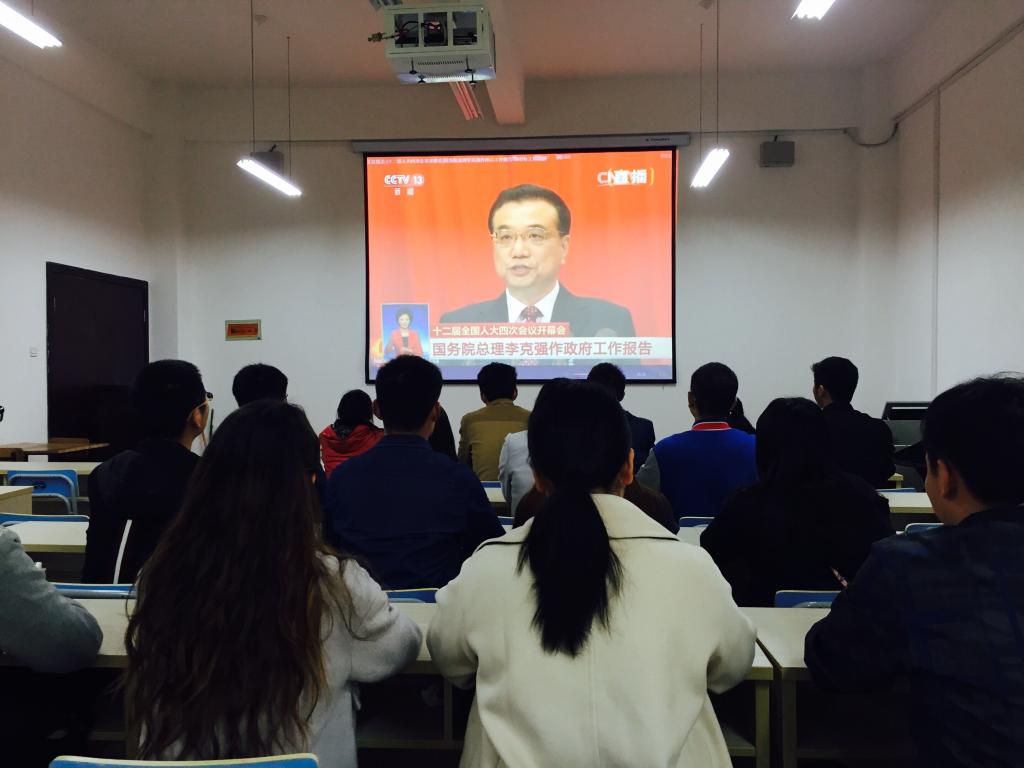 3月5日上午9时,第十二届全国人民代表大会第四次会议在北京人民大会堂隆重开幕,国务院总理李克强代表国务院向大会作政府工作报告。我校组织学生代表在教室、大学生活动中心、学生社区党团活动室等场所观看大会开幕实况,聆听了李总理的《政府工作报告》。其他学生纷纷踊跃在寝室收看开幕直播。
