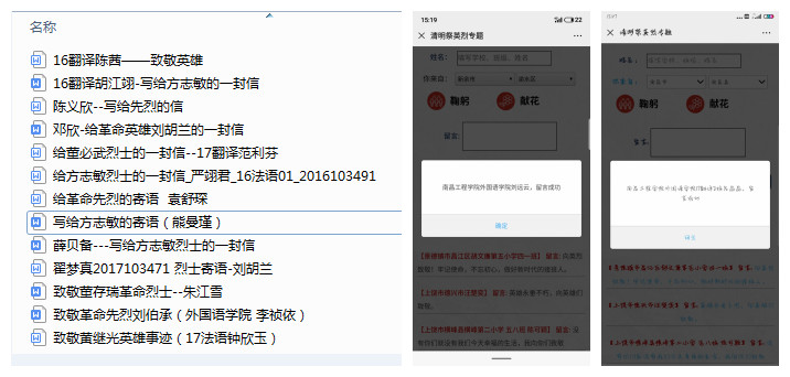 4月1-2日,外国语学院学生党支部通过微信公众号“文明江西”和“清明祭英烈”开展网上鞠躬、献花、向英烈致敬活动,并以“缅怀革命先烈,坚定理想信念”为主题,组织学生党员和入党积极分子撰写书信或寄语缅怀革命先烈。