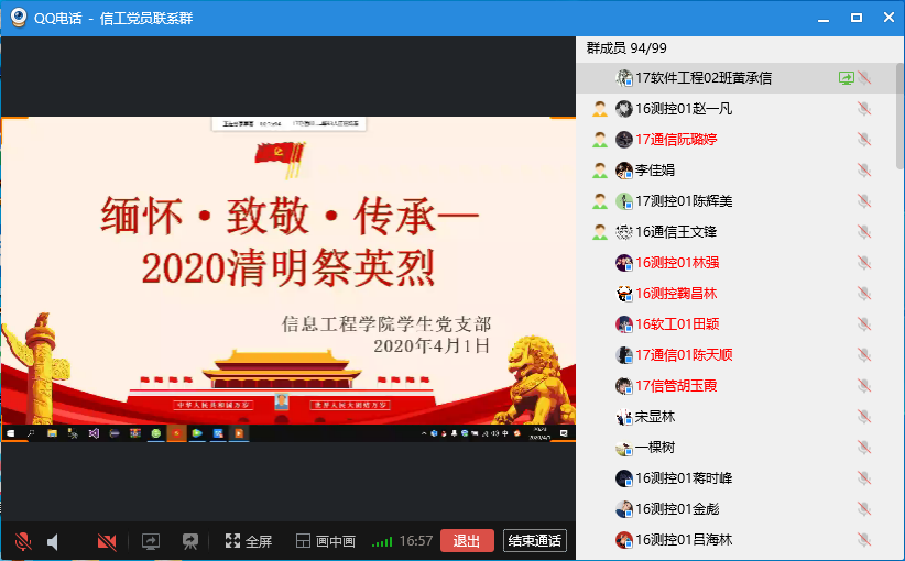 4月1日,国际教育学院学生党支部利用“腾讯会议”平台开展”清明祭英烈”线上党日活动,通过线上重温入党誓词、缅怀革命先烈和在疫情防控阻击战中牺牲的烈士、撰写心得体会、线上祭拜等形式,缅怀革命先烈,致敬抗疫英雄。
