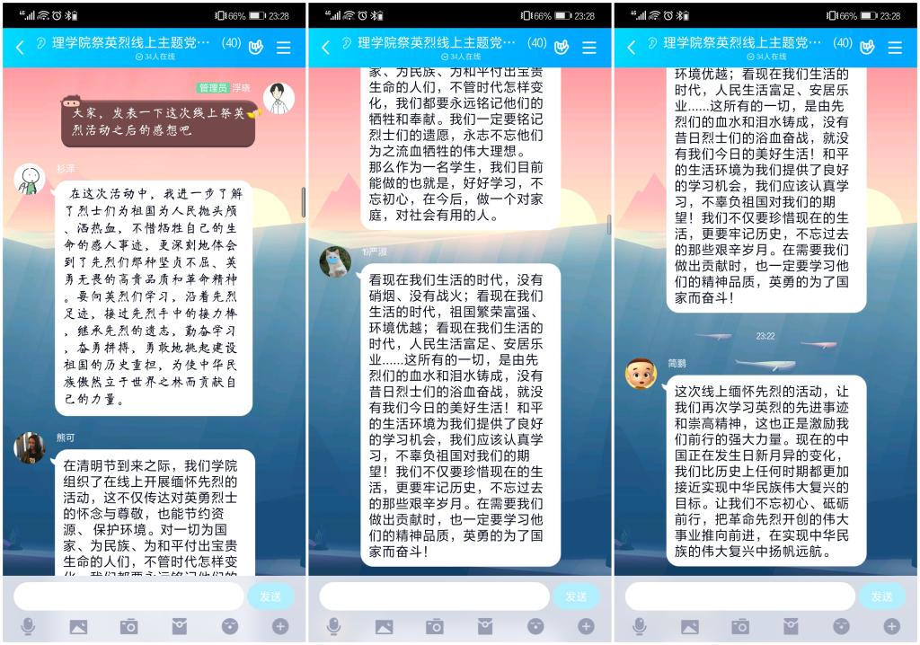 4月2日,理学院学生党支部组织开展“祭英烈”线上主题党日活动。学生党员通过网络“指尖祭典”方式,慎终追远,缅怀先烈。大家纷纷留言,表示要坚守初心,自觉把红色基因融入血脉,让英烈精神薪火相传。活动中,大家还深情诵读了经色经典作品《可爱的中国》。