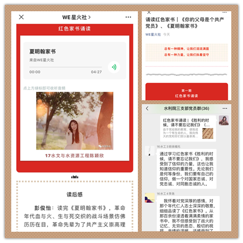 4月1日,水利与生态工程学院学生党支部组织开展“线上红色家书品读会”清明祭英烈主题党日活动。学生党员和入党积极分子化为革命烈士的“信使”,分别诵读了“你的父母是个共产党员——赵云霄写给女儿启明的信 ”“胜利的时候,请你们不要忘记我们!——裘古怀就义前给党和同志们的遗书 ”等6封经典红色家书,生动展现了革命烈士的理想信念和家国情怀。大家纷纷表示,同学们的诵读慷慨激昂、令人动容,透过一封封红色家书,看到的是一个个鲜活高大、有血有肉的英雄形象,感受到的是革命先烈们对理想信念的执着追求、对党的无限忠诚,从中汲取了奋进前行的力量。
