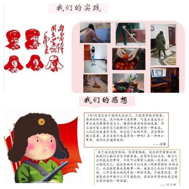 “学雷锋、做好事”的实践活动让两个班的学生兴奋不已。大家纷纷主动为家里打扫卫生、在社区做志愿活动、为居民测量体温、清扫马路垃圾……不知不觉中,雷锋精神已在同学们心中扎根开花。
