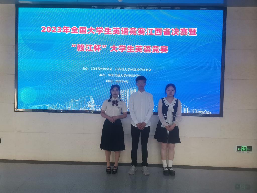 2023年全国大学生英语竞赛江西省决赛暨“赣江杯”大学生英语竞赛于6月3日-4日在华东交通大学举行。来自南昌大学、江西师范大学等全省54所高校近千名学生参加本次比赛。我校学子在大赛中取得优异成绩,其中,2020级英语专业方人文以全省第二名的优异成绩荣获AB类口语竞赛特等奖、综合竞赛特等奖;2020级英语专业乔文雅荣获AB类口语竞赛一等奖、综合竞赛二等奖;2020级法语专业李冰怡荣获C类口语竞赛一等奖、综合竞赛一等奖。