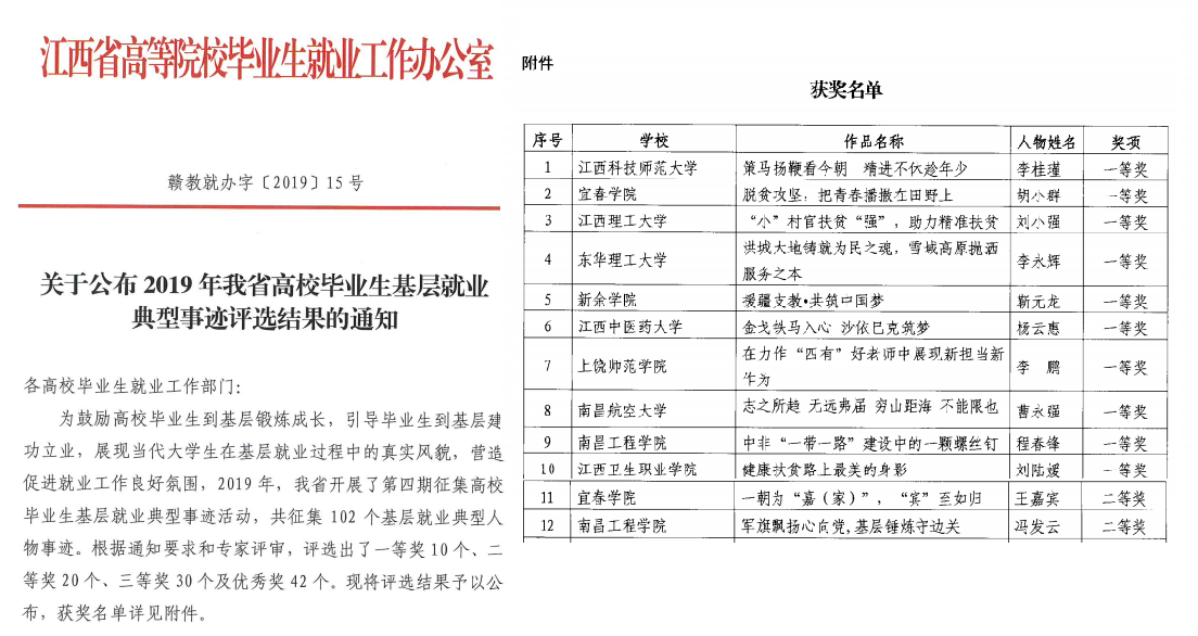 在2019年全省大学生基层就业人物典型事迹评选中,我校经济贸易学院选送的《中非“一带一路”建设中的一颗螺丝钉》和信息工程学院选送的《军旗向阳心向党,基层锤炼守边关》从全省高校选送的102个案例中脱颖而出,分别获得一、二等奖。(文/图 黄春文)