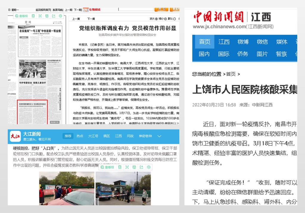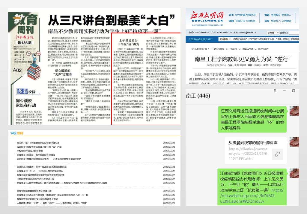 作用发挥“不止步”,展现新时代共产党员的责任担当。疫情发生以来,全校师生党员以各种形式广泛参与疫情防控,积极贡献自身的智慧和力量。他们以文战“疫”,党委宣传部党支部通过校园网、官微开辟先锋堡垒等专栏,积极宣传党员干部和师生先进事迹,江西日报、中新网、江南都市报、江西文明网、江西教育网等媒体纷纷予以报道,发出了战“疫”路上南工好声音;他们以艺战“疫”,校团委、人文与艺术学院党委组织师生党员精心创作原创歌曲《曙光》,谱写了致敬疫情防控中每一个“平凡英雄”的赞歌;他们以行战“疫”,党委组织部和机关党委发出号召,迅速组建学校疫情防控党员先锋队和核酸检测志愿服务队,广大师生党员闻令而动,不到一个小时就有70多名住在瑶湖校区的教工党员主动请缨报名参加物资运输、秩序维护和西次门门岗值守等工作。