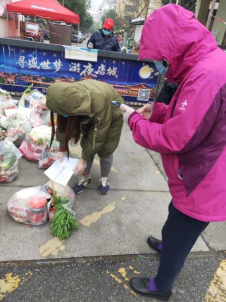 我还看见了团结友爱的邻里。政府配送蔬菜的大货车旁,自发帮忙卸货的居民站成了长长一条,大家有条不紊、相互接力。男人们主动送物资上门,女人们自主帮忙分拣菜品。偌大一车物资在居民井然有序的分工配合下,以最快的速度送达到了每家每户。