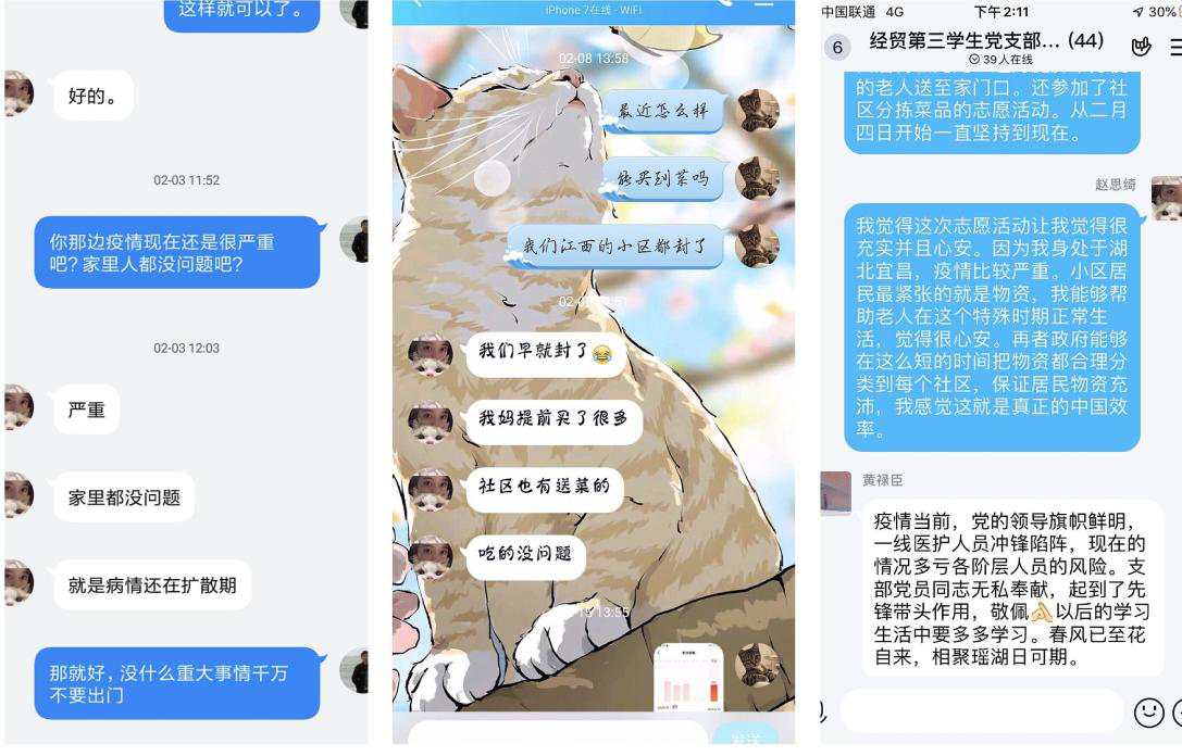 在疫情暴发初期,我既紧张又害怕,每次听见救护车鸣笛,身上的寒毛就会不自觉地竖起来。但当我听说社区有老人缺乏生活物资的时候,我脑海里就一个念头,我是一名大学生党员,我必须主动承担社区防疫工作,这是我义不容辞的责任。于是我每日主动联系不会使用微信的老人,帮助老人买菜送物资,常常奔走于小区的各个楼栋。然而也正因为这次志愿活动,让我看见了太多太多在这个特殊时期默默为他人服务的身边人。每一个人都足以让我在这个“寒冬”感受到温暖。
