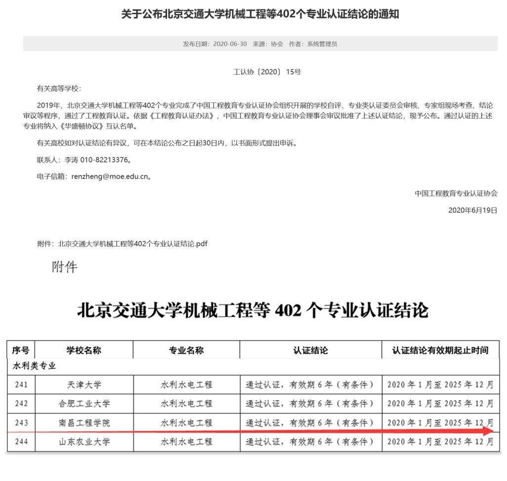 6月30日,中国工程教育专业认证协会发布了《关于公布北京交通大学机械工程等402个专业认证结论的通知》(工认协[2020]15号),公布了2019年工程教育专业认证的结论。经过学校自评、专业类认证委员会审核、专家组现场考查、结论审议等程序,我校水利水电工程专业顺利通过认证,认证时效为6年。