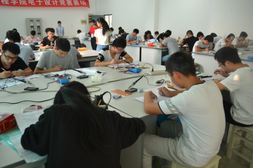 全校近百名同学参加了本次比赛。按赛制要求,参赛的同学必须按照规则,在七个半小时全封闭的赛场内,根据题目设计制作出一件电子产品并撰写一份设计报告。比赛过程中,同学们沉着冷静,全神贯注地焊接每一个电子元件,并进行调试。