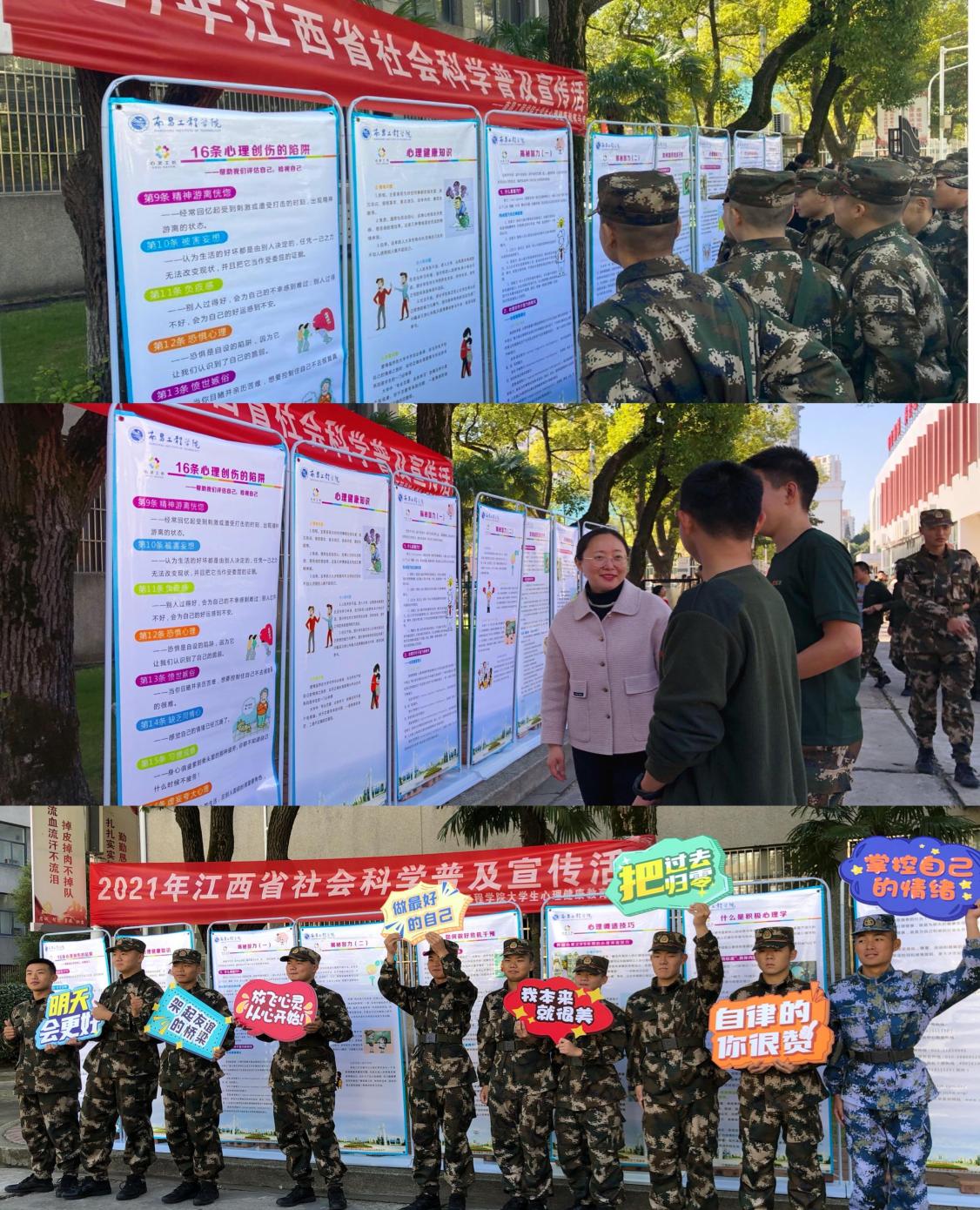 11月6日至12日,我校大学生心理健康教育与咨询中心(省社会科学知识普及宣传基地、省科普教育基地)开展了2021年江西省社会科学普及宣传周心理知识科普系列活动,结合学生心理成长中遇到的难点和挑战,有针对性的设计了入学适应、人际交往、学习等心理知识科普内容,通过讲座科普、科普展览、现场咨询、素拓活动、电影赏析等形式多样的活动,多举措扎实推进“我为群众办实事”实践活动。