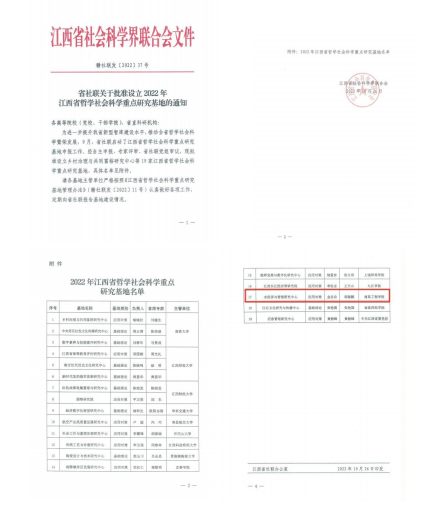 10月26日,江西省社会科学界联合会印发了《省社联关于批准设立2022年江西省哲学社会科学重点研究基地的通知》,我校经济贸易学院联合工商管理学院、马克思主义学院申报的“水经济与管理研究中心”获批立项,这是我校首个省社联基地。(文/图 崔建锋 姚小莉 责任编辑 潘旭 陈巧雄)