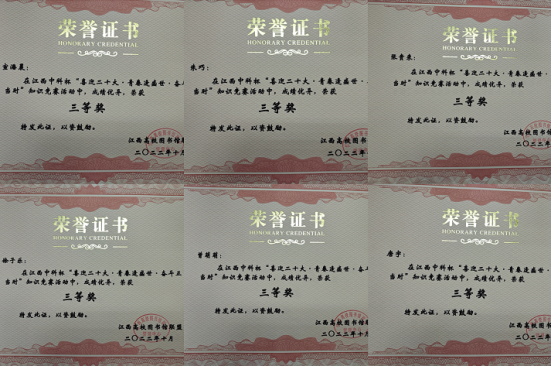 近日,江西省中科杯“喜迎二十大 青春逢盛世 奋斗正当时”主题教育知识竞赛活动顺利举行,我校图书馆积极组织指导学生参赛并获得三等奖6项、优秀奖3项的好成绩。