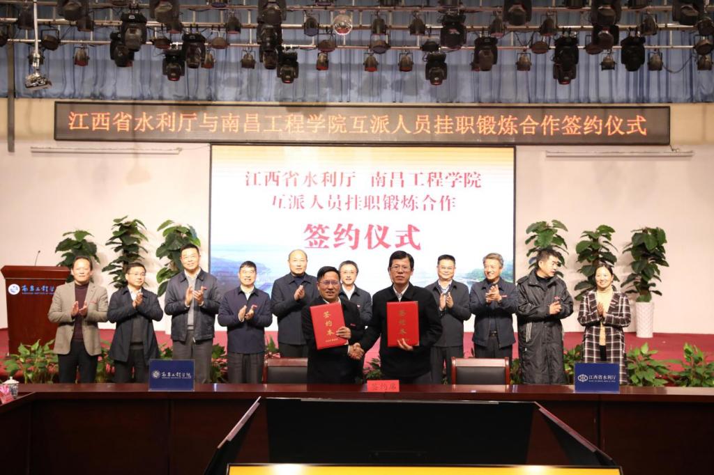 11月8日,我校与江西省水利厅互派人员挂职锻炼合作签约仪式在新时代文明实践中心(大学生活动中心)多功能厅举行。省水利厅党委委员、副厅长、省鄱阳湖水利枢纽建设办公室主任罗传彬,省水利厅党委委员、副厅长廖瑞钊,省水利厅党委委员、副厅长吴义泉,省水利厅党委委员、省河长制办公室专职副主任姚毅臣,以及校党委书记金志农、校长汪胜前等在家校领导出席仪式,省水利厅相关处室负责人,我校各学院院长、各部门主要负责人参加活动。