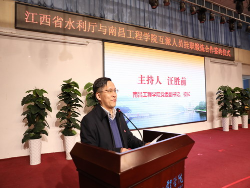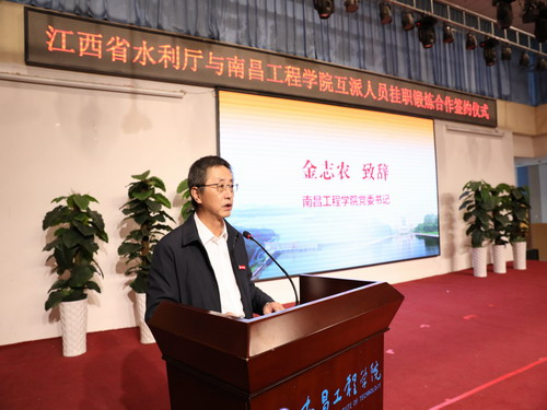 金志农在致辞时指出,学校始终坚持“围绕水利电力科学,打造创新型学科群”的办学理念,秉承“自强不息、格物致知”校训精神培养适应水利电力行业和经济社会需求的高素质创新人才。学校水利工程学科群在水工程安全、水资源保护、新策源地水土保持、智慧水利等领域开展了长期的科学研究和技术成果推广,产生了良好的生态经济效益和社会效益。学校与省水利厅开展互派人员跟班学习(挂职锻炼)合作,将对学校更好服务国家水利事业和江西经济社会发展,加强地、校合作和师资队伍建设起到有力的推动作用。