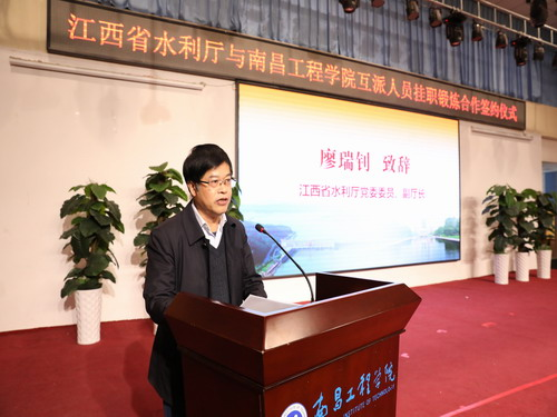 廖瑞钊在致辞时指出,近年来我省水利改革取得巨大成就,水利事业高质量发展需要高素质高层次人才作为支撑。南昌工程学院是江西省人民政府与水利部共建高校,历史悠久,水利特色优势突出,取得了一批原创性、标志性、有特色的科技成果,培养了一批又一批优秀人才,为地方经济社会发展和水利事业作出了积极贡献。江西省水利厅与南昌工程学院开展互派人员跟班学习(挂职锻炼)合作,是认真贯彻落实中央关于深入实施新时代人才强国战略,加快人才培养的实际行动,也是全面贯彻习近平总书记提出的“十六字”治水方针的重要举措,将进一步加强双方在水利管理、科技等方面人才培养工作,在迈向高质量综合型人才培养方面更进一步,对于促进江西水利人才事业蓬勃发展必将产生重要的影响。