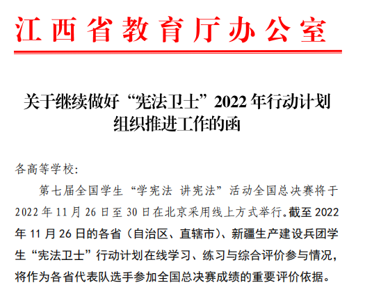 近日,省教育厅办公室发布《关于继续做好“宪法卫士”2022年行动计划组织推进工作的函》,共有37所高校学生在线学习与考试,参与率达100%,我校位列其中。