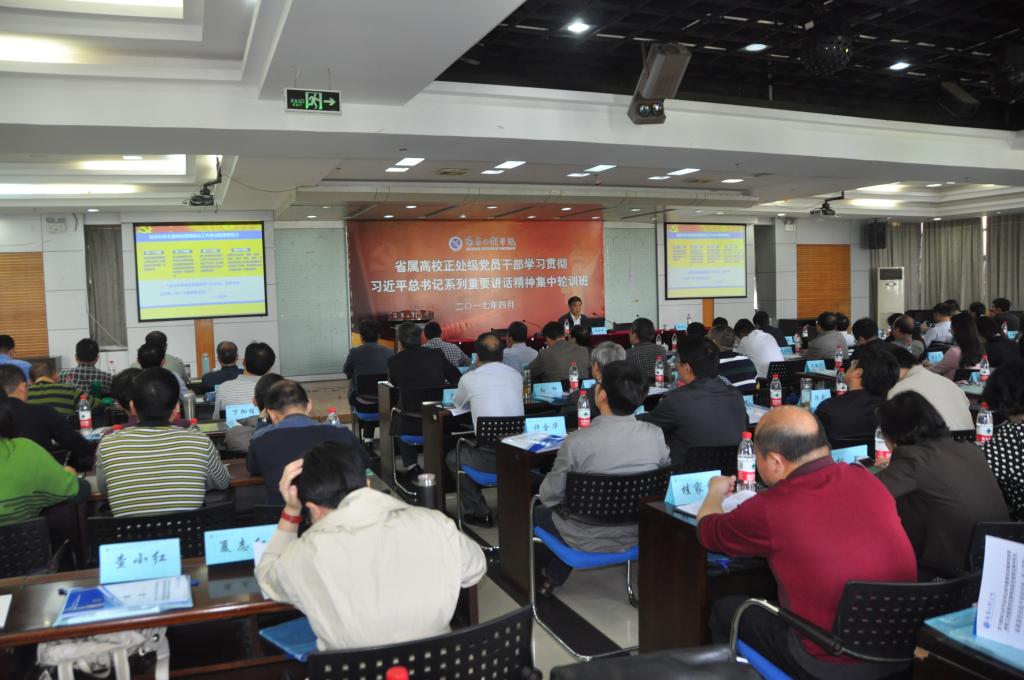 开班式后,周金堂作了题为“认真学习习近平总书记重要讲话,切实加强我省高校思想政治工作”的专题辅导报告。他首先论述了习近平总书记在全国高校思想政治工作会议上重要讲话的历史意义和时代背景;接着阐述了习近平总书记在全国高校思想政治工作会议上重要讲话的理论支撑与主要内容;最后提出了认真学习、深刻领会、贯彻落实习近平总书记重要讲话,切实加强和改进高校思想政治工作的思路和要求。他提出,贯彻落实习近平总书记重要讲话,加强和改进高校思想政治工作要与贯彻落实中央[2016]31号文件结合起来;要与深刻领会中央[2004]16号文件、中央[2016]31号文件结合起来;要与教育部党组通知要求和省委贯彻落实讲话和会议精神的主要工作部署结合起来;要与贯彻落实有关讲话、会议、文件精神,加强和改进我省高校思政工作结合起来。他强调,要坚持高校的办学定位,巩固马克思主义意识形态在高校的指导地位;要针对存在的问题,切实抓好高校思政工作“补短板”工作;要坚持按规律办事,提高思政工作的针对性、实效性。