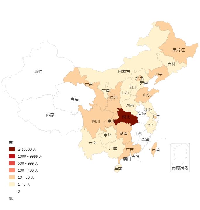 根据国家卫健委3月12日公布的数据,现有确诊14914人,从当天的中国疫情分布图中可以看到,安徽、福建、江西、青海、新疆、西藏这6个省份已无现有确诊病例。
