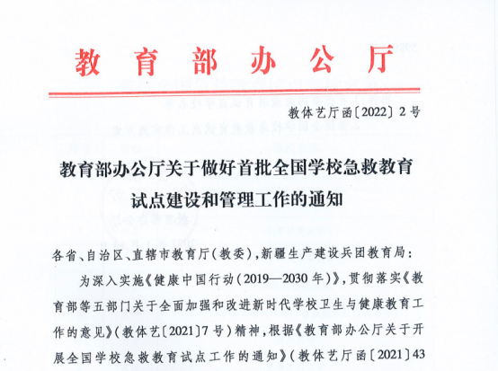 近日,教育部办公厅发布《教育部办公厅关于做好首批全国学校急救教育试点建设和管理工作的通知》,公布了首批全国急救教育试点学校名单,我校位列其中。(文图/付园 责任编辑 周冠佳 潘旭)