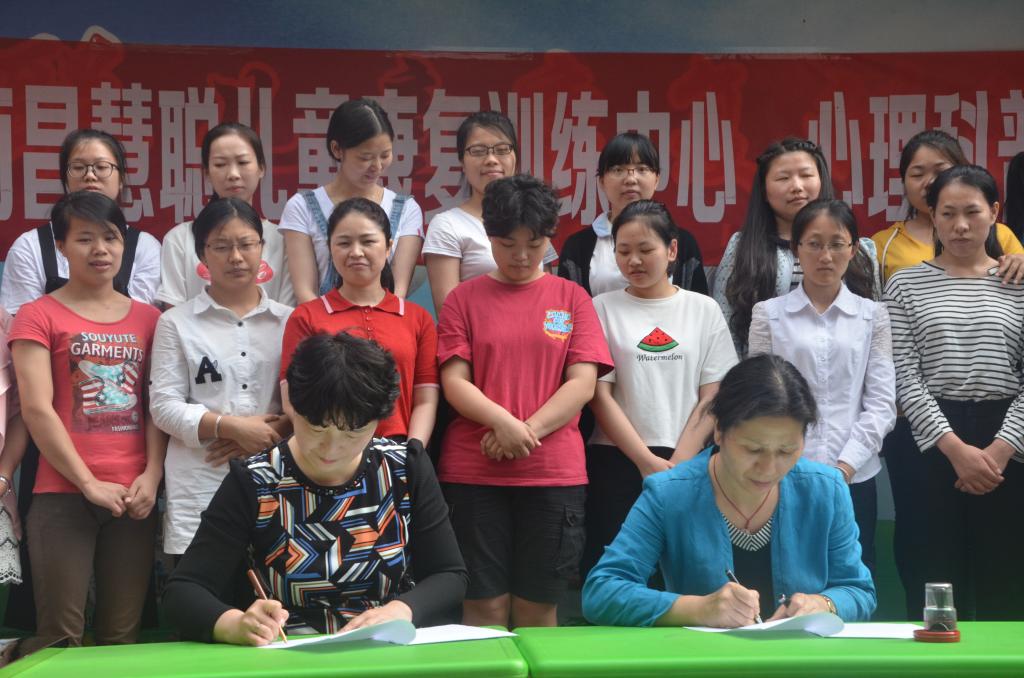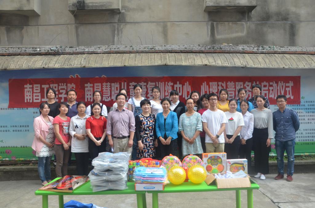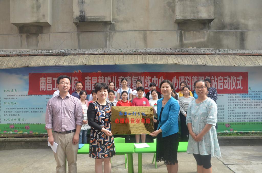 5月24日下午,我校在南昌慧聪儿童康复训练中心举行心理科普服务站签约、授牌仪式。校学生工作处处长胡盛华、南昌慧聪儿童康复训练中心负责人张洁冰及学校部分教师、大学生志愿者代表出席仪式。
