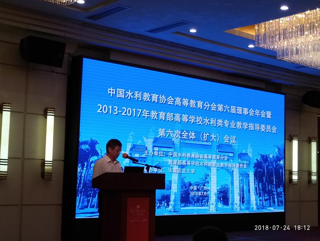 7月23日至25日,中国水利教育协会高等教育分会第六届理事会年会暨2013-2017年教育部高等学校教学指导委员会水利类专业教学指导委员会第六次全体扩大会议在华南农业大学召开。中国水利教育协会会长黄河出席会议并讲话。中国水利教育协会高教分会会长、河海大学校长徐辉教授作报告。会议由中国水利教育协会高教分会常务理事华北水利水电大学校长刘文锴教授主持。中国水利教育协会高教分会副会长、我校校长金志农应邀出席会议,宣读“十佳未来水利之星”获奖名单,并作大会总结。中国水利教育协会高等教育分会第六届理事,高教分会各研究会成员,2013-2017年教育部高等学校水利类专业教学指导委员会委员,各专业建设指导组成员,有关水利院校教师及学生代表参加了会议。中国水利教育协会高教分会常务理事吴泽俊、汪荣有副校长及我校高等学校水利类专业教学指导委员会部分委员参加了会议。 (文/图 陈方红)
