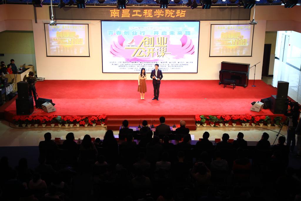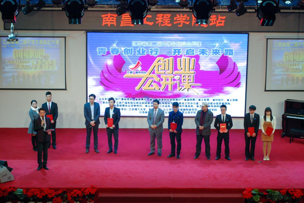 12月25日下午,以“青春创业行、开启未来路”为主题的江西省第二届大学生创业公开课在我校大学生活动中心举行。校党委副书记张立青、副校长汪胜前、江西省教育厅就业办副主任舒正鸣、江西广播电视台综合新闻频率副总监卢洁华等出席,我校相关部门负责人及部分教师和学生观摩了这次公开课。向阳生涯集团北京公司总经理李信辉、先锋天使咖啡众创空间副总经理沈尢、江西盛竹联创农林发展有限公司总经理陈飞、金吉列留学江西省分公司总经理蔡建刚担任大赛评委和创业导师。
