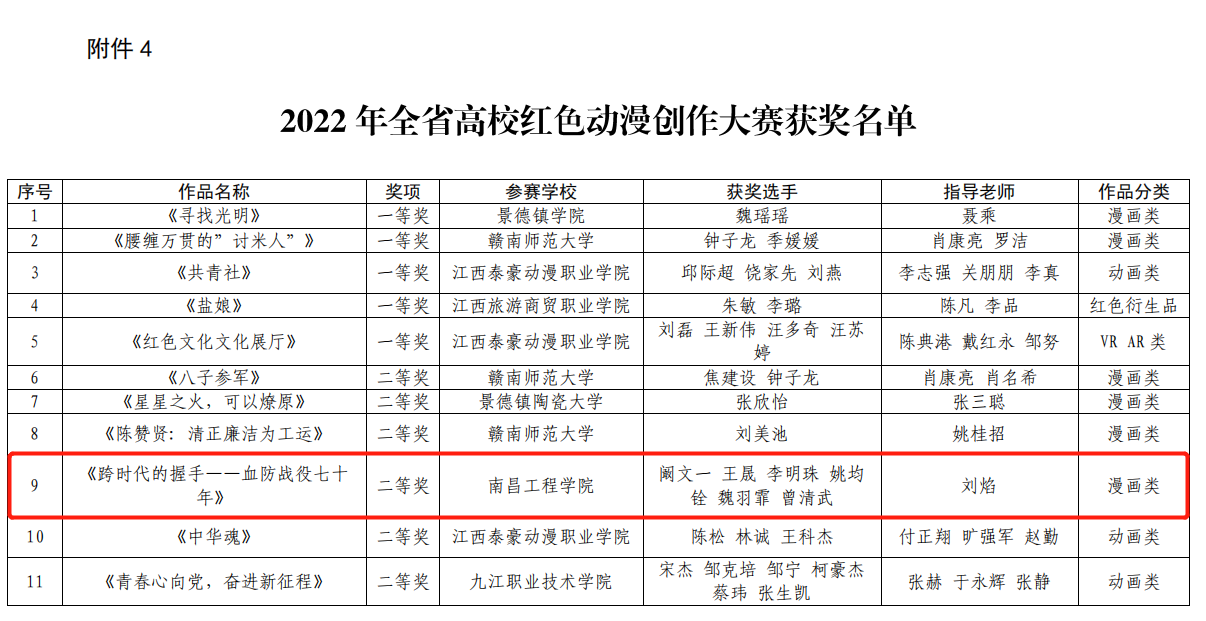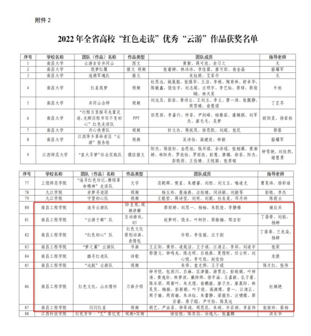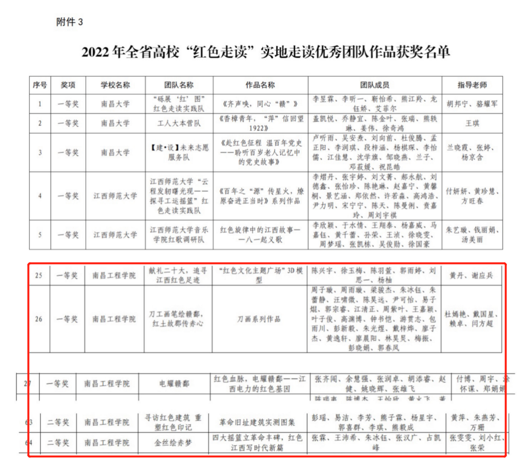 近日,省委教育工委、省教育厅公布了2022年度“红色班级”创建、“红色走读”、红色动漫创作大赛等活动评选结果,我校“红色赤水班”入选江西省高校“红色班级”创建试点,8项作品荣获全省高校“红色走读”优秀“云游”作品(获奖数量并列第一),“红色走读”实地走读优秀团队作品获一等奖3项(获奖数量并列第一)、二等奖2项,获全省高校红色动漫创作大赛二等奖1项,获奖层次和数量都位居全省高校前列。