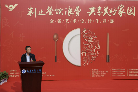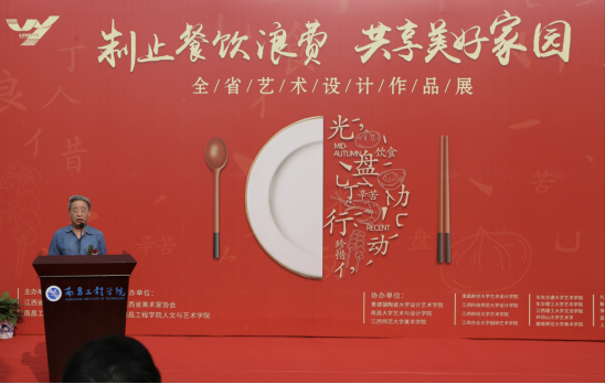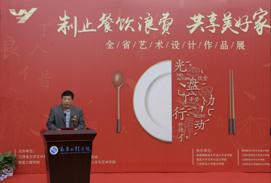 3月26日下午,“制止餐饮浪费 共享美好家园”江西省艺术设计作品展在我校开幕。原江西省政协副主席肖光明出席开幕式并宣布作品展开幕。中国书法家协会副主席、中国美协理事、江西省文联副主席毛国典,校党委副书记、校长金志农出席开幕式并分别致辞。原南昌大学党委书记郑克强,原江西省文联副主席、省美协主席蔡超,副校长汪胜前,纪委书记殷安全,副校长周敏丹,江西省美术家协会、江西省工艺美术学会、江西日报社、江西师范大学、南昌大学和我校师生代表参加活动。殷安全主持开幕式。