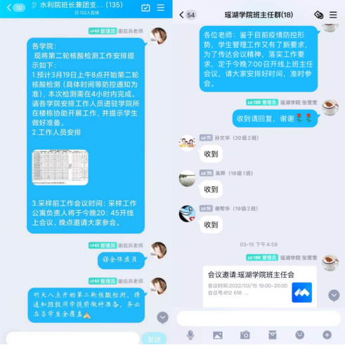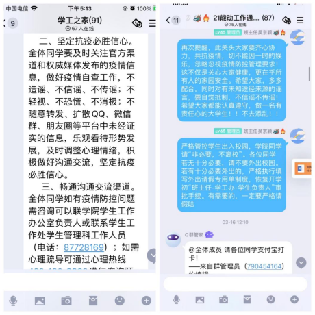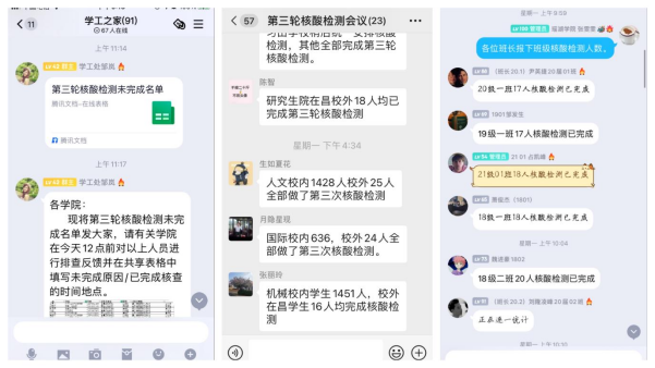 全体辅导员坚持守土有责、守土尽责,不漏一个岗位,通过认真学习贯彻习近平总书记关于疫情防控的重要讲话精神,以及省委、省政府、省委教育工委和南昌市最新疫情防控政策和文件精神,切实提高有效应对复杂疫情形势的能力。他们坚守战“疫”一线、工作不掉线,每天利用班级微信群、QQ群、网络平台,一遍遍向学生传达学校疫情防控要求,传播防疫知识贴士,畅通信息渠道、做好人文关怀,提醒学生不信谣、不传谣、不造谣。各学院先后多次组织召开核酸检测工作线上线下布置会、应急预案讨论会,通过辅导员、班主任会议、线上班会及时传达学校有关要求,做到全员覆盖,尽最大努力凝聚师生坚定信心、同舟共济、众志成城、同心抗疫的共识。