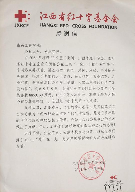 近日,江西省红十字基金会向我校致感谢信,对我校师生的爱心善举表达了敬意和感谢。