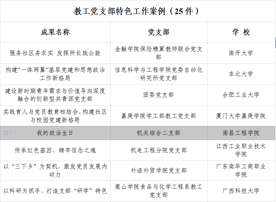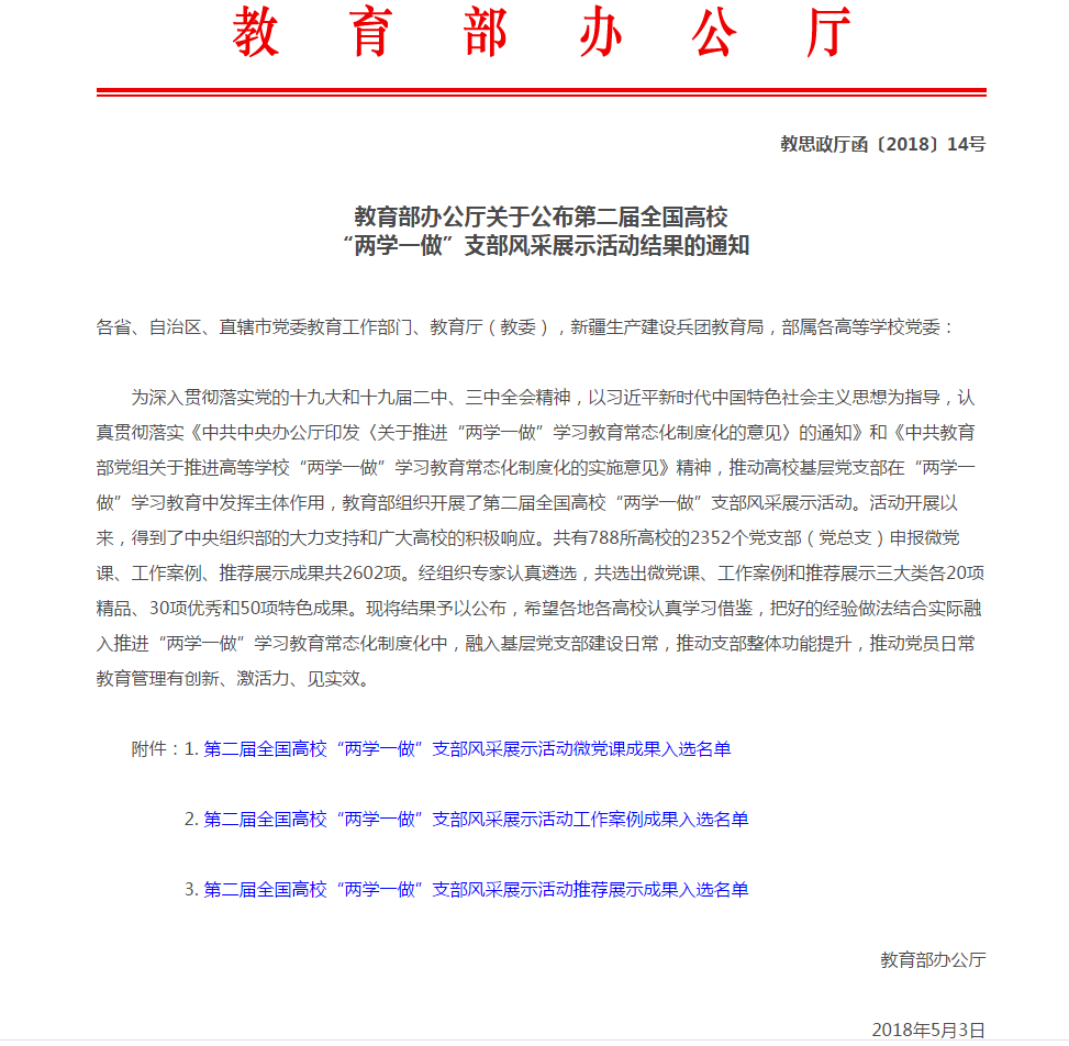 日前,教育部办公厅印发《关于公布第二届全国高校“两学一做”支部风采展示活动结果的通知》(教思政厅函〔2018〕14号),我校机关综合二支部“我的政治生日”案例获评第二届全国高校“两学一做”支部风采展示教工党支部特色工作案例。