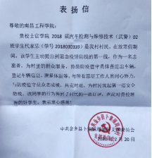 2018级汽车检测与维修技术(武警)2班代家乐同学,来自山东省济宁市金乡县卜集镇。疫情期间,他主动提出前往抗疫一线,勇敢向疫情“宣战”,守卫一方村民。他为村里的群众服务,协助防疫值守员做好排查、登记、测量体温等工作。他的举动受到村民一致好评,所在村委会专门向学校发来表扬信。