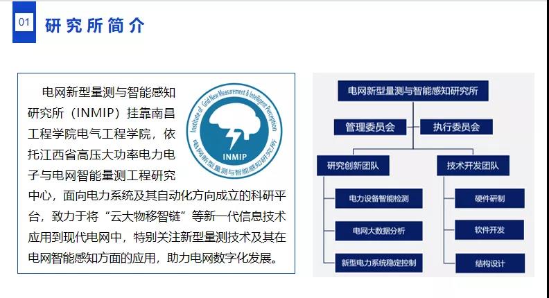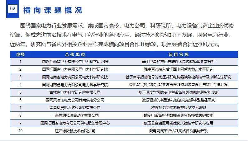 电网新型量测与智能感知研究所挂靠电气工程学院,依托江西省高压大功率电力电子与电网智能量测工程研究中心,是面向电力系统及其自动化方向成立的科研平台,结合学校水利电力特色,紧紧围绕国家电力行业发展需求,集成国内高校、电力公司、科研院所、电力设备制造企业的优势资源,促成先进前沿技术在电气工程行业的落地应用,通过技术创新和协同发展,服务电力行业发展。近两年,与省内外相关企业合作完成横向项目合作10余项,项目经费合计近400万元。