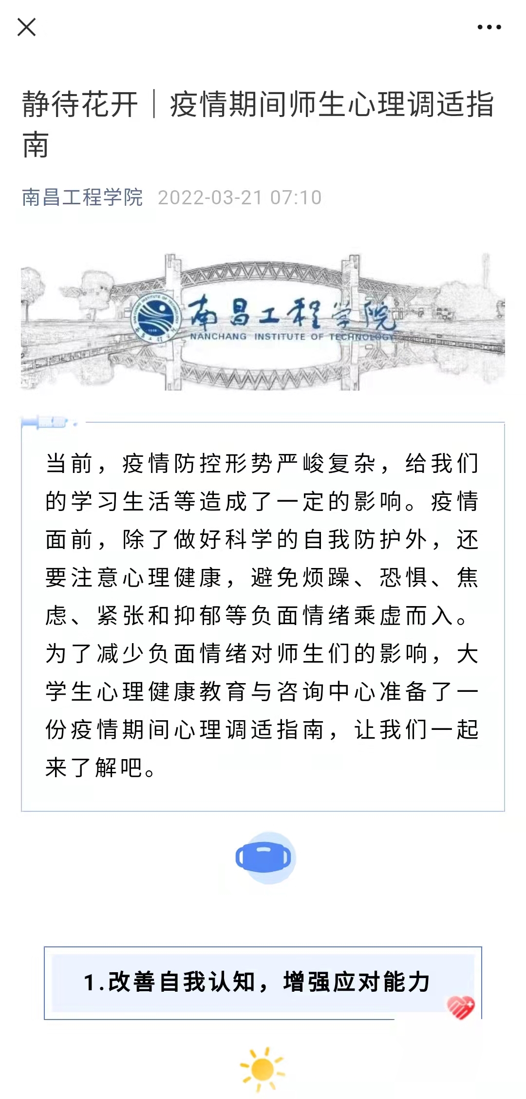 编者按:近期,全国疫情防控形势严峻,给我们的学习、生活、出行等造成了一定影响。疫情面前,除了做好科学的自我防护外,还要注重心理健康,避免焦虑、恐慌和抑郁等负面情绪趁虚而入。及时加强学生心理疏导,做好人文关怀,是打赢这场战争的重要一环。党委宣传部(新闻中心)通过校园网、官微开辟“疫”心防护专栏,今天推出第一篇:大学生心理健康教育与咨询中心积极做好疫情防控期间心理健康关爱教育。
