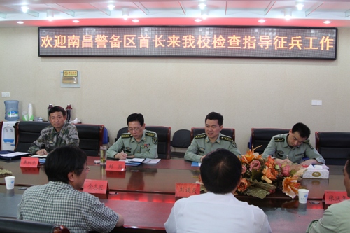 5月4日,南昌市委常委、南昌警备区司令员刘瑄带领青山湖区人武部部长李细平、政委吴绘云和警备区司令部军动办主任杨波一行4人来到我校,对我校国防教育和大学生征兵工作进行检查指导。校党委书记刘谟炎、校长金志农、党委副书记张立青出席征兵改革试点工作座谈会。座谈会由征兵办主任、人武部部长张跃年主持。