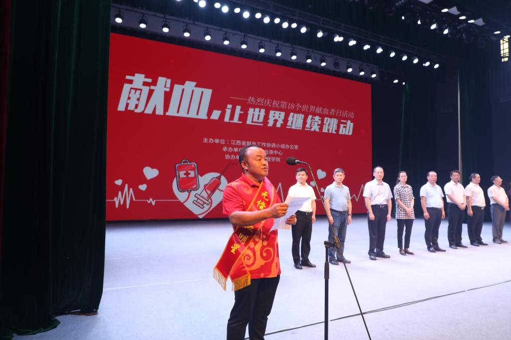 今年的6月14日是第18个世界献血者日,活动的主题是“献血,让世界继续跳动”。6月10日,由江西省献血办主办、江西省血液中心承办、我校协办的江西省庆祝第18个世界献血者日活动在我校举行,来自省献血工作协调小组成员单位干部队伍,省直医疗单位领导及专家义诊队伍,高校大学生队伍,支持献血公益事业的部分公司企业,以及固定献血者、志愿者代表、新闻媒体共计600余人参加活动。副校长李明出席活动并致辞。