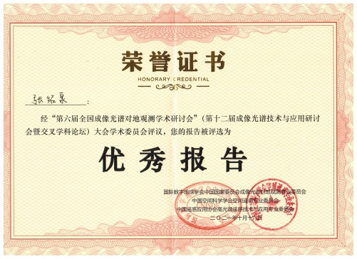 10月14日至16日,以“成像光谱对地观测与生态文明建设”为主题的第六届全国成像光谱对地观测学术研讨会在浙江省宁波市召开,我校信息工程学院张绍泉、李璠等教师应邀参会。张绍泉博士在“成像光谱遥感解混与亚像元制图”分会场作题为“联合空谱信息的高光谱遥感图像稀疏解混”的报告,介绍了我校智能视觉信息处理与应用团队在高光谱遥感图像空谱稀疏解混方面取得的最新成果,受到与会学者的广泛关注,扩大了我校在相关领域的知名度。经专家评审和大会学术委员会评议,该报告获优秀学术报告奖。(文/图 张绍泉 责任编辑 周冠佳 潘旭)