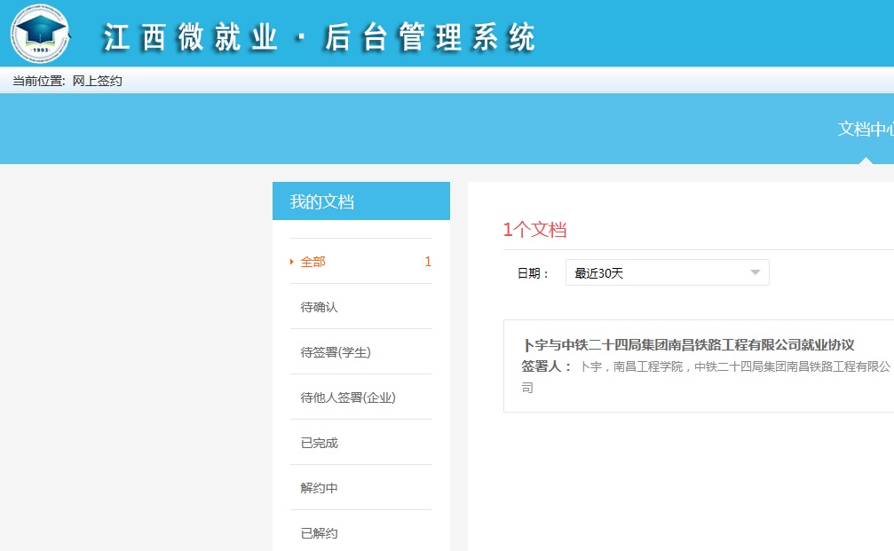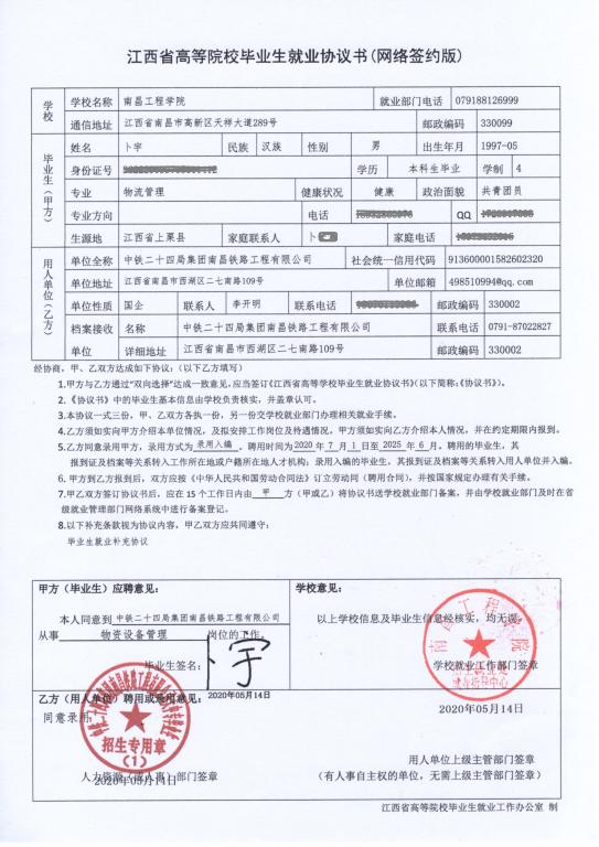 为响应上级号召,简化毕业生签约程序,保障用人单位和毕业生双方合法权益,在江西省高校毕业生就业工作办公室的强力推动和支持下,我校校友企业江西金格科技股份有限公司及时开发了“江西省普通高校毕业生就业协议书电子签约平台”。5月14日,我校2020届物流管理专业毕业生卜宇与中铁二十四局集团南昌铁路工程有限公司通过网签系统,签订电子就业协议书。这是江西省开通高校毕业生网上签约系统后,正式生效的第一份电子就业协议书。