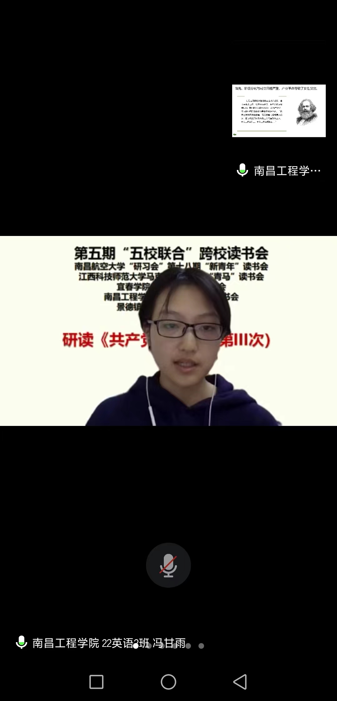 我校外国语学院2022级英语专业冯甘雨同学做了《共产党宣言与女性解放》的学习报告,围绕马克思恩格斯关于资本主义社会中的女性状况、《共产党宣言》中的女性解放逻辑以及习近平总书记关于妇女事业发展的重要论述等三个方面开展解读。报告深入浅出,得到了与会师生的普遍好评。我校马克思主义学院教师、“原著品读活动”发起人王诚德对上述五校同学的读书报告逐一进行了点评。(文/王建东 图/王诚德 责任编辑 潘旭 刘华帆)