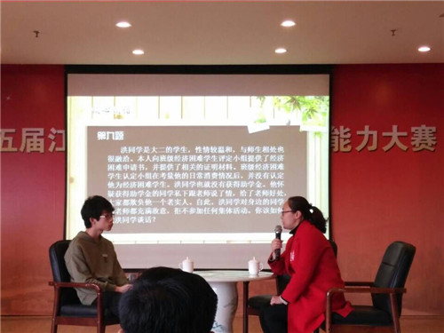 本次大赛设笔试(基础知识测试和网文写作)、主题班会、案例分析、主题演讲和谈心谈话五个环节,全面考察辅导员的专业基础知识、语言表达能力、逻辑思维能力、临场应变能力和运用网络开展大学生思想政治教育工作的能力。300余名来自全省各高校的代表观摩了大赛。
