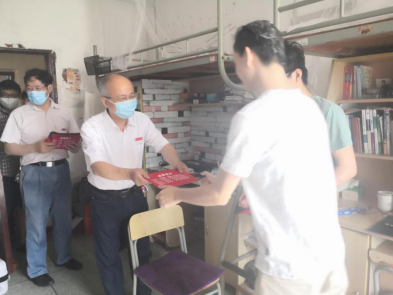 5月14日,副校长汪荣有来到学3栋宿舍看望理学院返校学生,为他们送去“防疫健康包”等慰问品。理学院党政负责人随同看望。