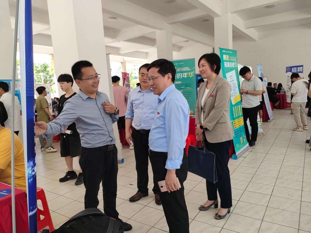 在招聘会现场,汪胜前与前来招聘选才的企业代表亲切交流,详细了解校友企业的发展状况和用人需求,充分肯定校友们在学校发展中的贡献,希望校友们发挥市场主体作用,提供更多的就业岗位资源,助力2023届毕业生更好就业。