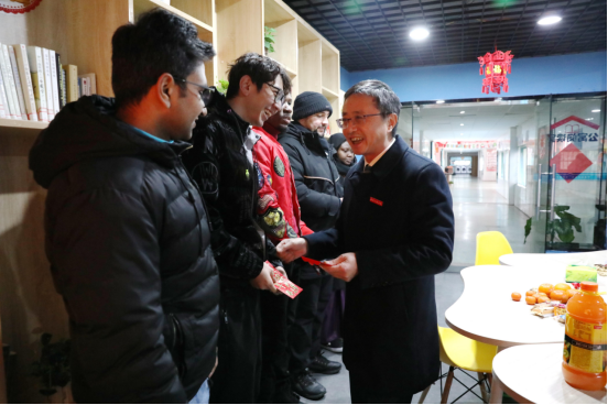 瑞牛舞动丰收岁,金虎喜吟锦绣春。1月31日农历除夕,校党委书记金志农、校长汪胜前、副校长周敏丹一行来到学生公寓11栋、润园食堂,看望寒假留校学生,给同学们送上精美围巾、春节红包和慰问品,与坚守岗位一线的教职工们欢聚一堂、共进年夜饭并送上良好的新春祝愿。