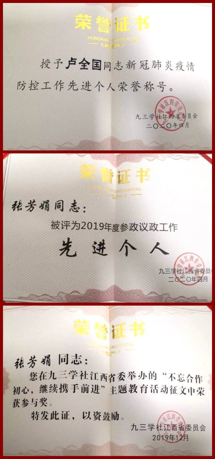 4月29日,九三学社江西省八届四次全体会议在南昌召开。中共江西省委常委、省委组织部部长刘强出席会议并讲话。省政协副主席、九三学社省委会主委李华栋作工作报告。会议表彰了一批先进集体和先进个人。我校九三学社委员会被授予“2019年度省直基层组织综合考评能力建设先进集体”荣誉称号。我校九三学社委员会主委卢全国被授予“新冠肺炎疫情防控工作先进个人”荣誉称号,社员张芳娟荣获“2019年度参政议政先进个人”和“‘不忘合作初心,继续携手前进’主题教育活动征文”参与奖。