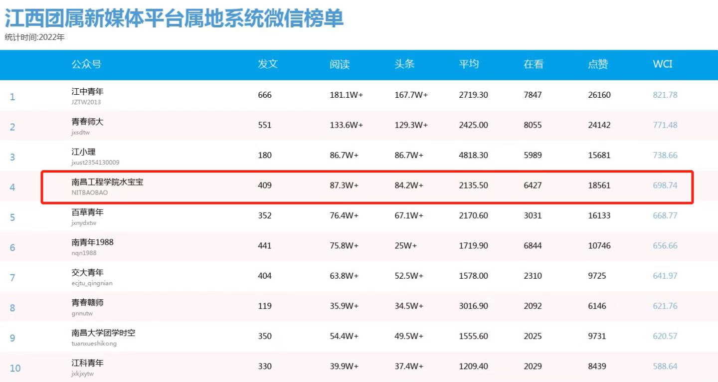 近日,共青团江西省委公布2022年度全省团属新媒体榜单,我校“南昌工程学院水宝宝”微信公众号排名全省高校团委第四。