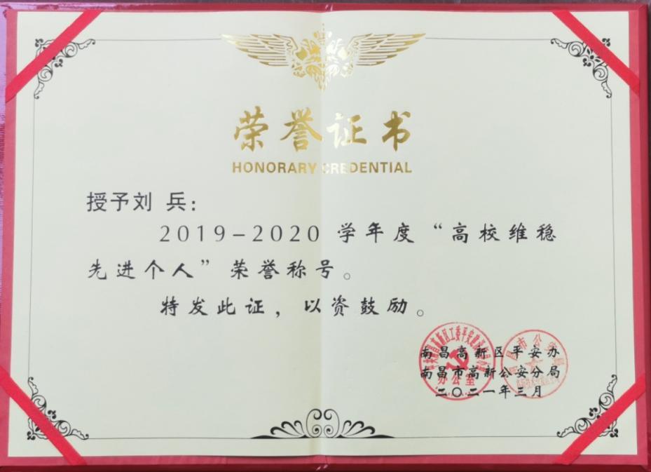 近日,南昌高新区平安办、公安分局发布《关于表彰2020年度高校维稳工作先进单位和先进个人的表彰决定》,我校被评为2019—2020年度“高校维稳协作先进单位”,保卫处刘兵同志被评为“高校维稳工作先进个人”。(文/李丁宁 图/陈玮 责任编辑 周冠佳 潘旭)