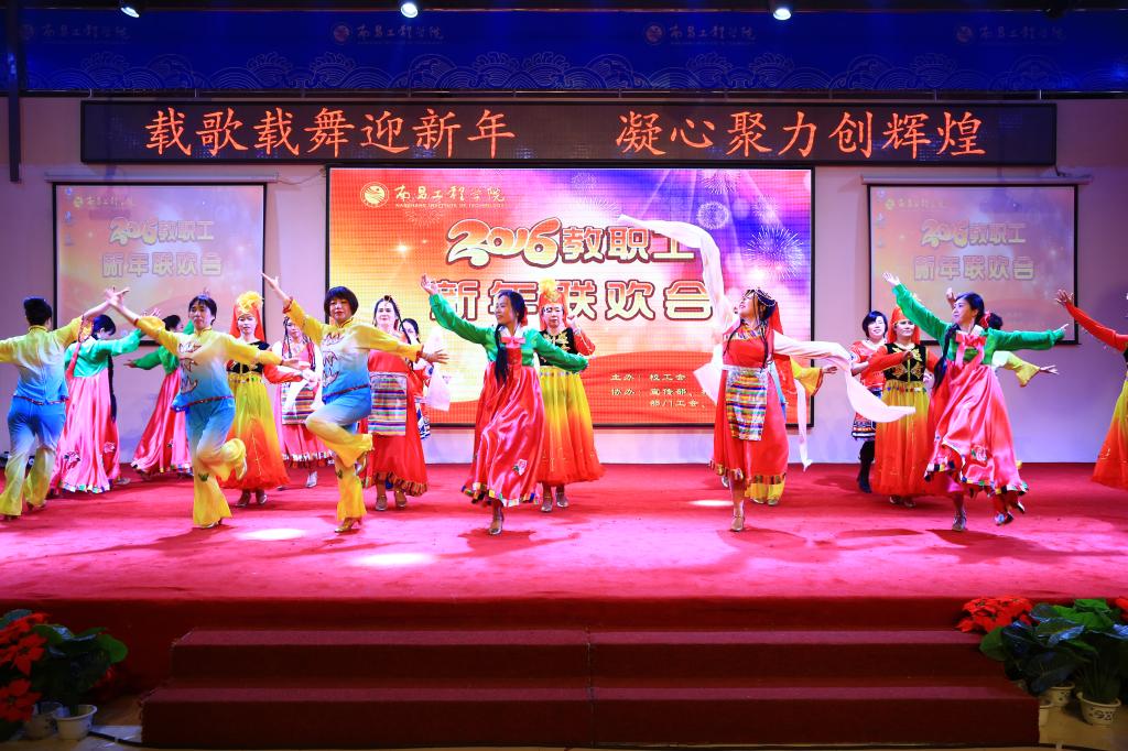 载歌载舞迎新年,凝心聚力创辉煌。12月29日下午,我校在大学生活动中心举办了2016年教职工新年联欢会。在家校领导刘谟炎、张立青、梁钢、吴泽俊、汪胜前、李明、樊后保、汪荣有、胡敏以及教职工代表400余人欢聚一堂,观看文艺演出,共庆元旦。